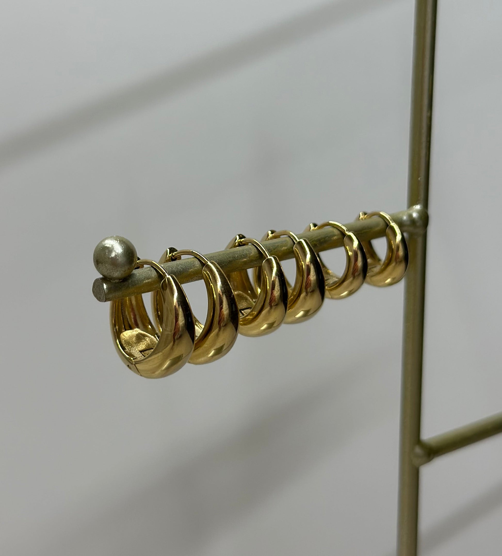 Set di 3 coppie di orecchini con chiusura a scatto in acciaio inox anallergico.
