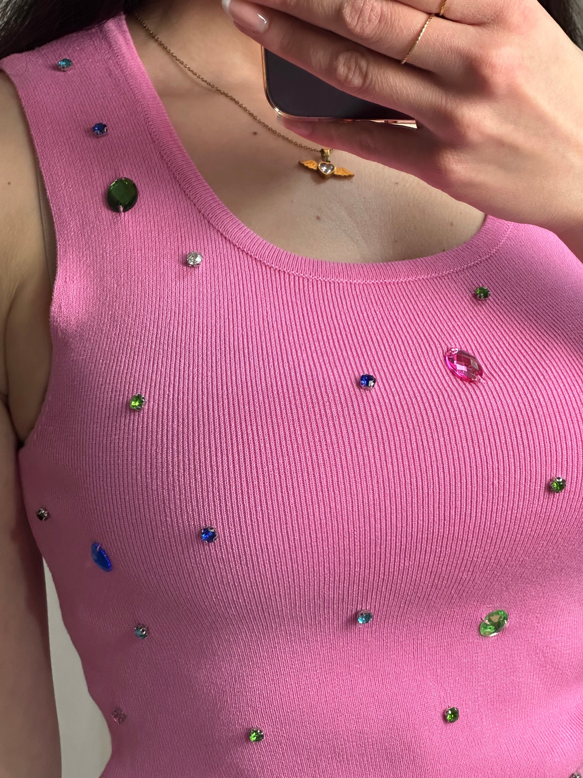 Top modello canotta con pietre in vari colori. In maglia effetto costine. Tessuto morbido ed elastico. Scollo quadrato.